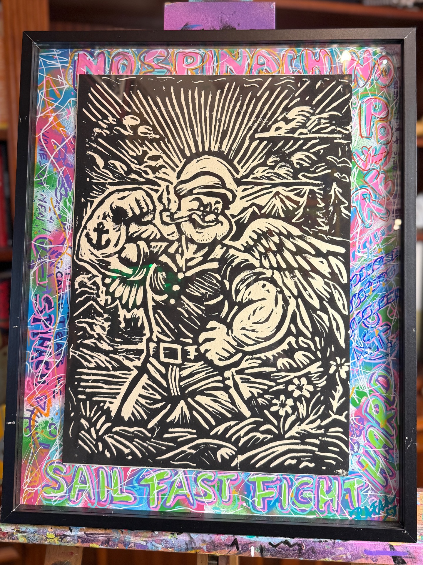 Autorsky podepsaný a očíslovaný limitovaný linoryt.Ručně vyřezaný a vytištěný.Každá pasparta je ručně domalovaná – pokaždé jiná.Každý kus je originál.Zasklené, zarámované. Rovnou na zeď