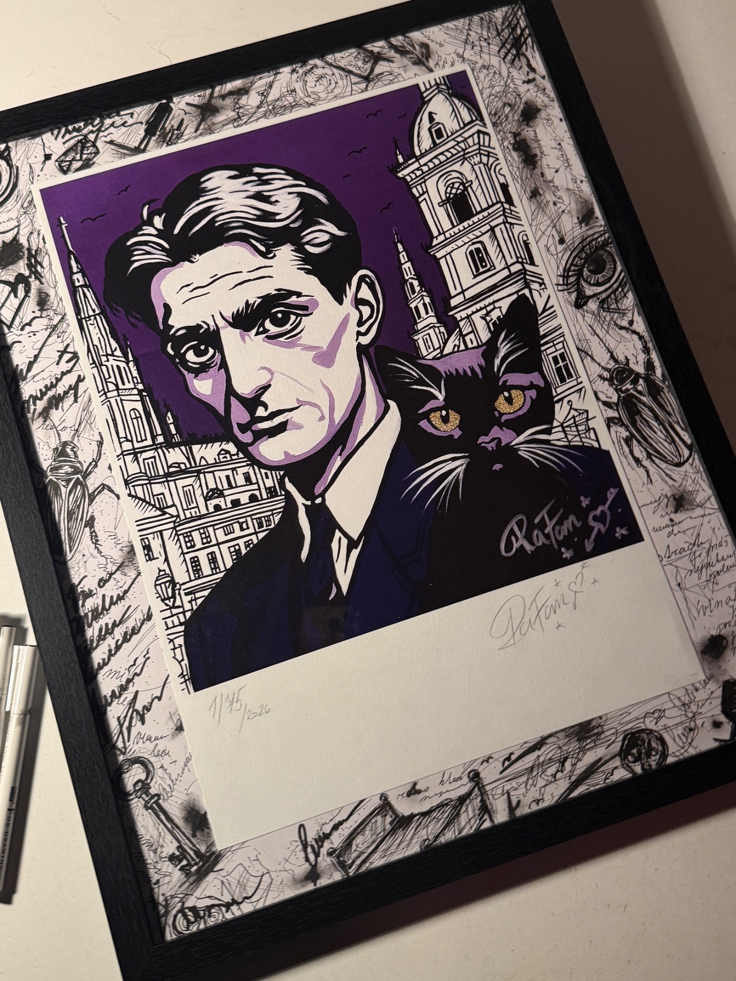 Každý je signovaný, zarámovaný a doplněný ručně domalovaným pozadím.